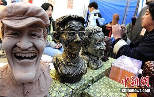 3月31日,觀眾在第三屆北京非物質(zhì)文化遺產(chǎn)博覽會(huì)現(xiàn)場(chǎng)體驗(yàn)民間手工藝人泥塑藝術(shù)創(chuàng)作。展臺(tái)前其創(chuàng)作的著名相聲大師馬三立、著名表演藝術(shù)家趙本山等名家泥塑像,吸引參觀者駐足。