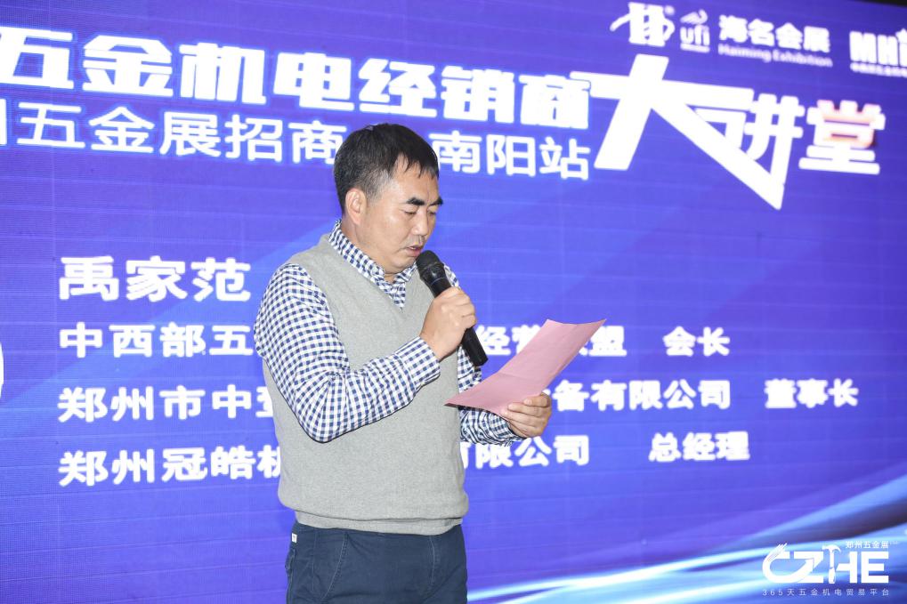 中西部五金機(jī)電創(chuàng)新經(jīng)營聯(lián)盟常務(wù)副會長、南陽鑫盛機(jī)電柴向陽柴總作為南陽地區(qū)優(yōu)秀經(jīng)銷商代表上臺致辭歡迎。柴總首先代表南陽地區(qū)五金機(jī)電經(jīng)銷/批發(fā)商對于本次經(jīng)銷商大講堂選址南陽表示歡迎,柴總講到南陽作為豫鄂陜交界地區(qū)區(qū)域性中心城市、國家區(qū)域中心城市、中國首批新能源示范城市、高新技術(shù)產(chǎn)業(yè)開發(fā)城市,海名會展·鄭州五金展,一個(gè)擁有優(yōu)秀的產(chǎn)業(yè)鏈資源,匯聚行業(yè)前沿觀點(diǎn)、趨勢的中西部地區(qū)五金機(jī)電行業(yè)最具價(jià)值的綜合服務(wù)平臺。