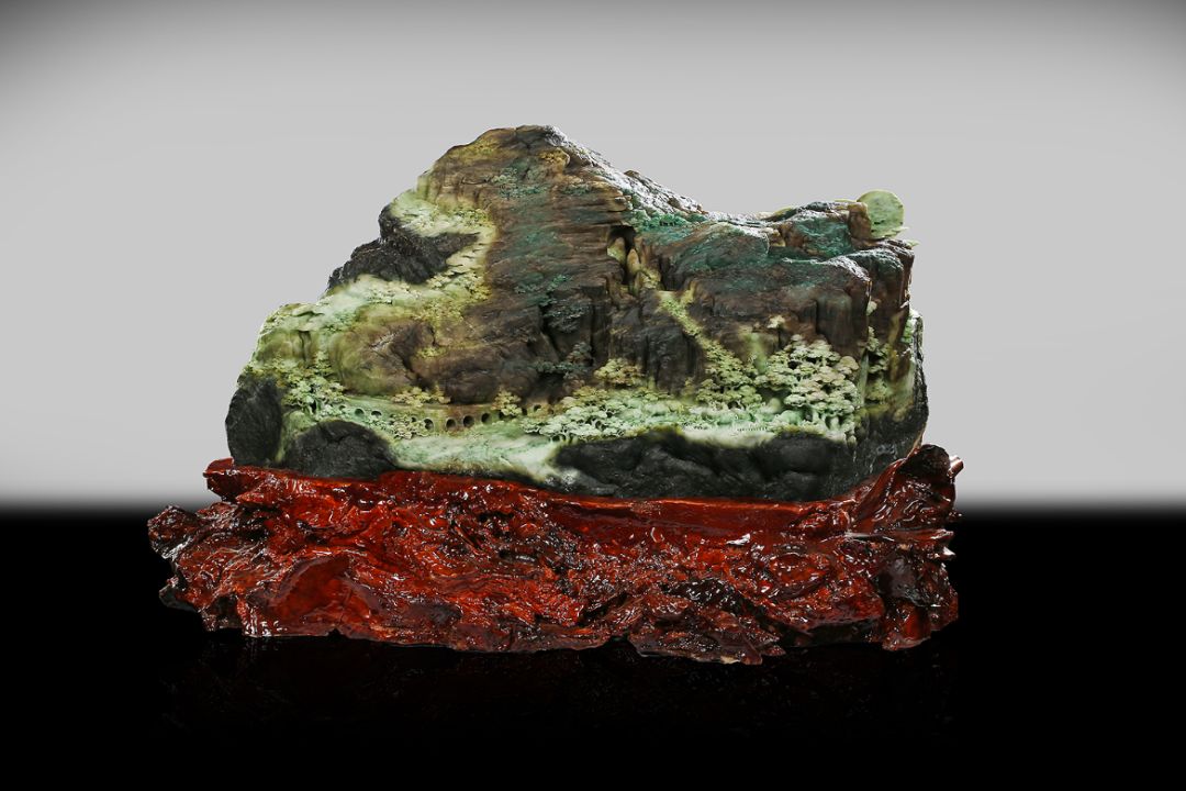 作品《巍巍太行》材質(zhì)為獨(dú)山玉,作品靈感源于自然山林。此原料為雜色獨(dú)山玉,綠、白、褐、青等顏色相互呈浸染狀或漸變過渡狀存在于同一塊體上,其塊度大,形狀似山峰。作者以此為基礎(chǔ),用巧奪天工的高超技藝雕刻出太行山勝景。借用中國(guó)山水畫中散點(diǎn)透視,高遠(yuǎn)、深遠(yuǎn)、平遠(yuǎn)的“三遠(yuǎn)”表現(xiàn)手法,巧用顏色體現(xiàn)前后關(guān)系以及畫面立體感。近處的樹林、橋梁、牛群、流水;遠(yuǎn)處的庭閣、房屋、小路、云彩,以淺色表現(xiàn),比例適當(dāng)、線條流暢、細(xì)節(jié)處理到位傳神,能抓住觀者第一視角。以褐、棕色表現(xiàn)山脈,突顯山脈的陡峭層疊、莊重巍峨之感,太行山的大氣磅礴與山中生活意境之美完美呈現(xiàn)。