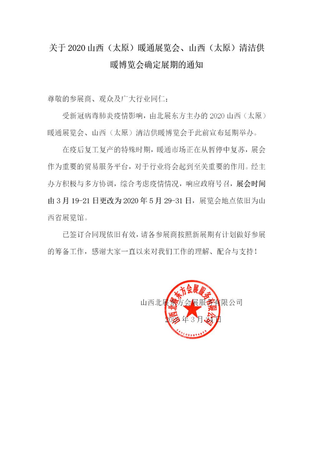 根據(jù)新型肺炎疫情防控需要,為貫徹落實黨中央和山西省政府做好新型冠狀病毒感染的肺炎疫情防控工作,切實保障廣大參展商和觀眾及各界朋友們的健康安全,確保參展企業(yè)的參展效果和采購商的參觀體驗,原定于3月19-21日在山西舉辦的2020山西(太原)暖通展覽會延期至5月29-31日舉辦。