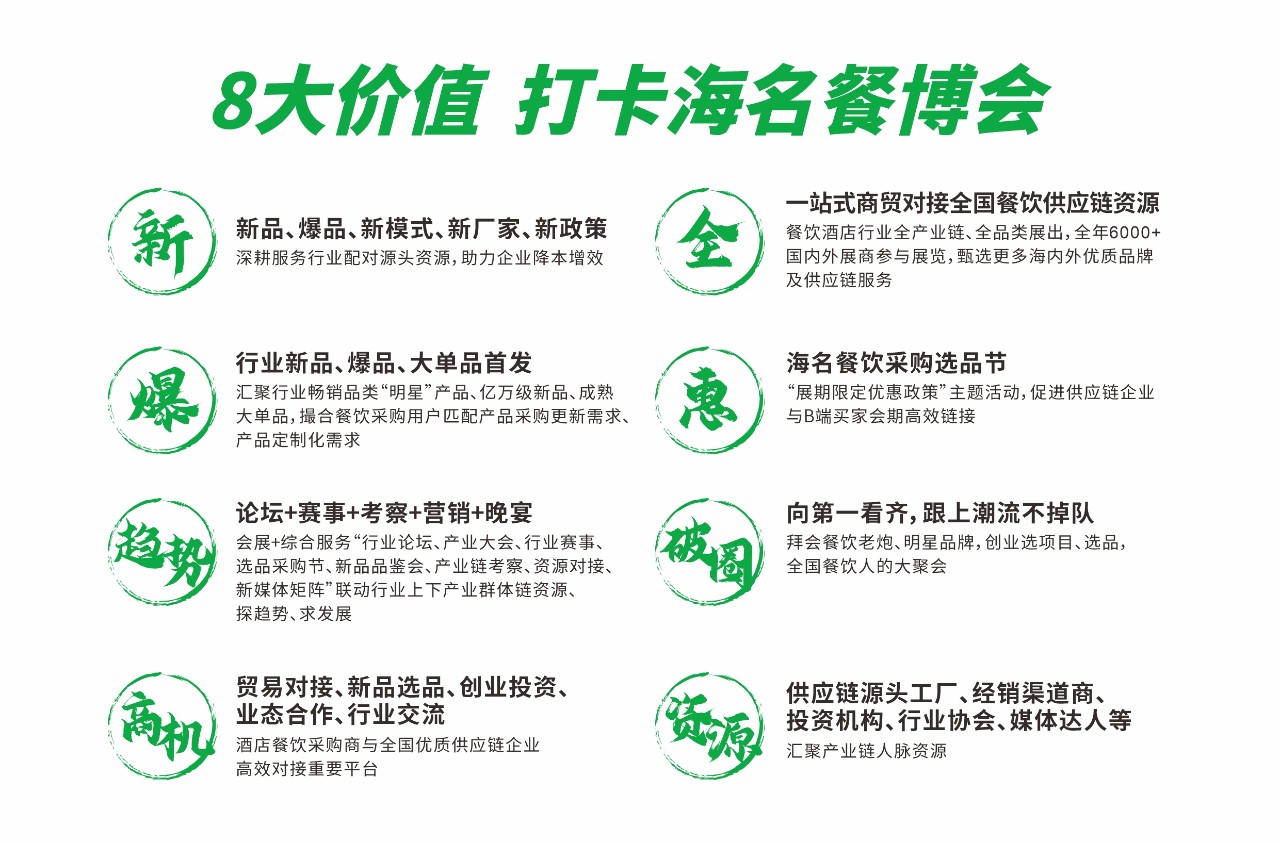 10年磨一劍,海名餐飲供應(yīng)鏈系列展無論在展會(huì)規(guī)模、影響力以及展會(huì)效果等方面,均取得行業(yè)的認(rèn)同;創(chuàng)新價(jià)值模式,打造餐飲供應(yīng)鏈“會(huì)展+產(chǎn)業(yè)”綜合服務(wù)平臺(tái)。其中海名成都餐博會(huì)作為中西部區(qū)域全產(chǎn)業(yè)鏈、全品類、全渠道的行業(yè)盛會(huì),始終引領(lǐng)著餐飲行業(yè)發(fā)展;不僅面向全國用戶展示餐飲供應(yīng)鏈領(lǐng)域的年度新品、爆品、先進(jìn)技術(shù)、定制化解決方案等,更是促進(jìn)行業(yè)發(fā)展,屬于餐飲酒店采購商與全國優(yōu)質(zhì)供應(yīng)鏈企業(yè)高效對(duì)接的重要平臺(tái)。